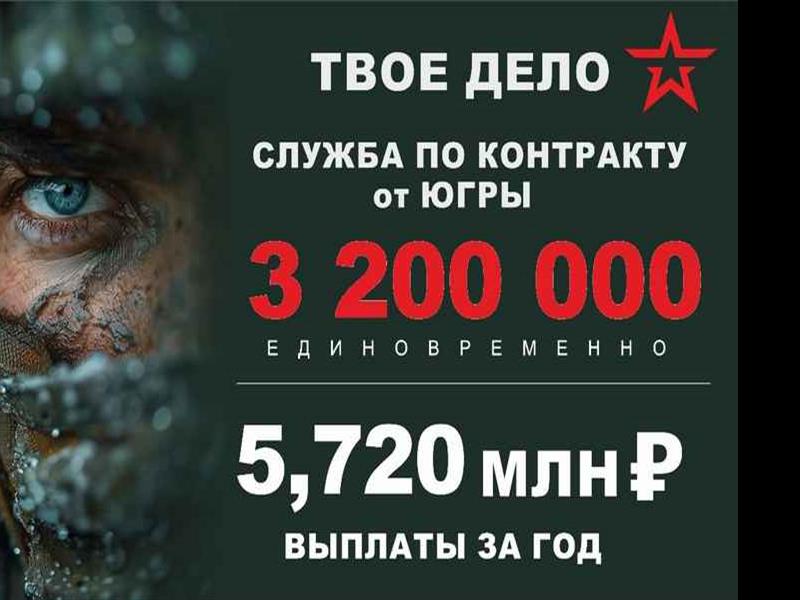 При заключении контракта через военкомат Нижневартовского района Вы получите единовременную выплату в сумме: 3 200 000 рублей, а общая сумма в год выплат от 5 800 000 руб.